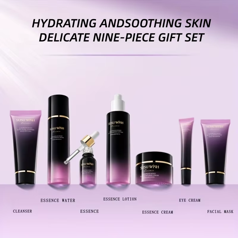 This nine-piece moisturizing essence set is designed as a complete daily facial skincare routine. It comes in exquisite gift box packaging, making it suitable for gifting.